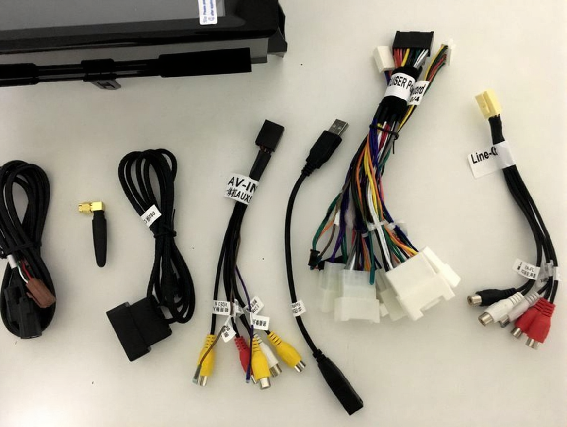 • Провода тюльпаны RCA (линейники на усилитель, выход на сабвуфер, AUX, видео вход и выход, вход под камеру заднего вида)