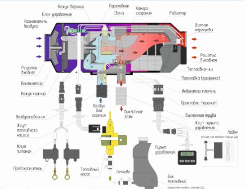Отопитель забирает воздух снаружи или изнутри отсека, где он установлен, и выдает уже  нагретый воздух в обогреваемое пространство, обеспечивая тем самым комфорт и тепло в условиях низкой температуры.